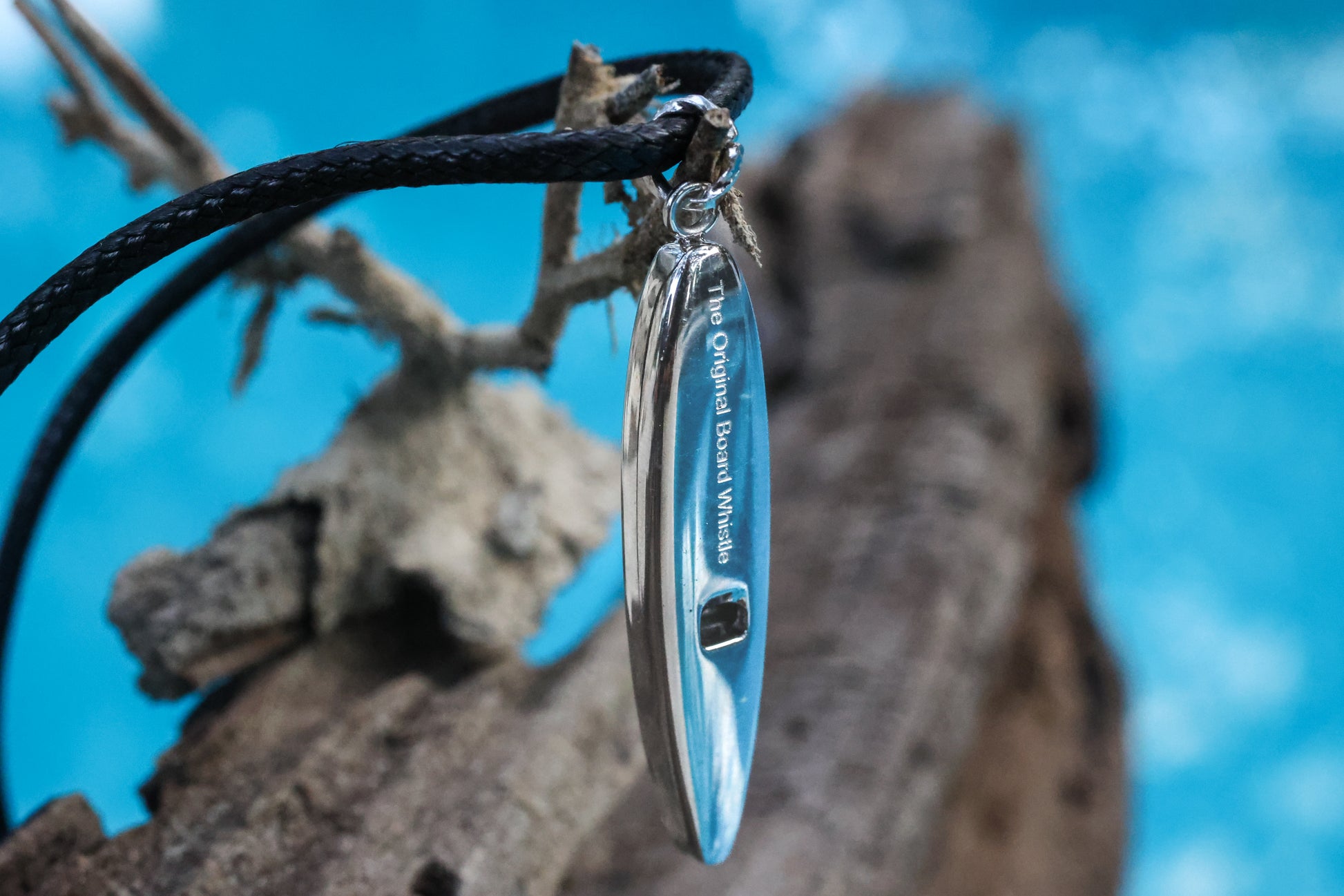 The Original Boardwhistle is a 1.5" stainless steel whistle with an embossed raised decking. It comes with a 24" black leather cord and lobster clasp.